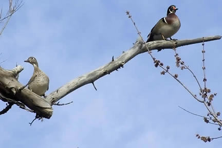Couple de canards branchu perchés